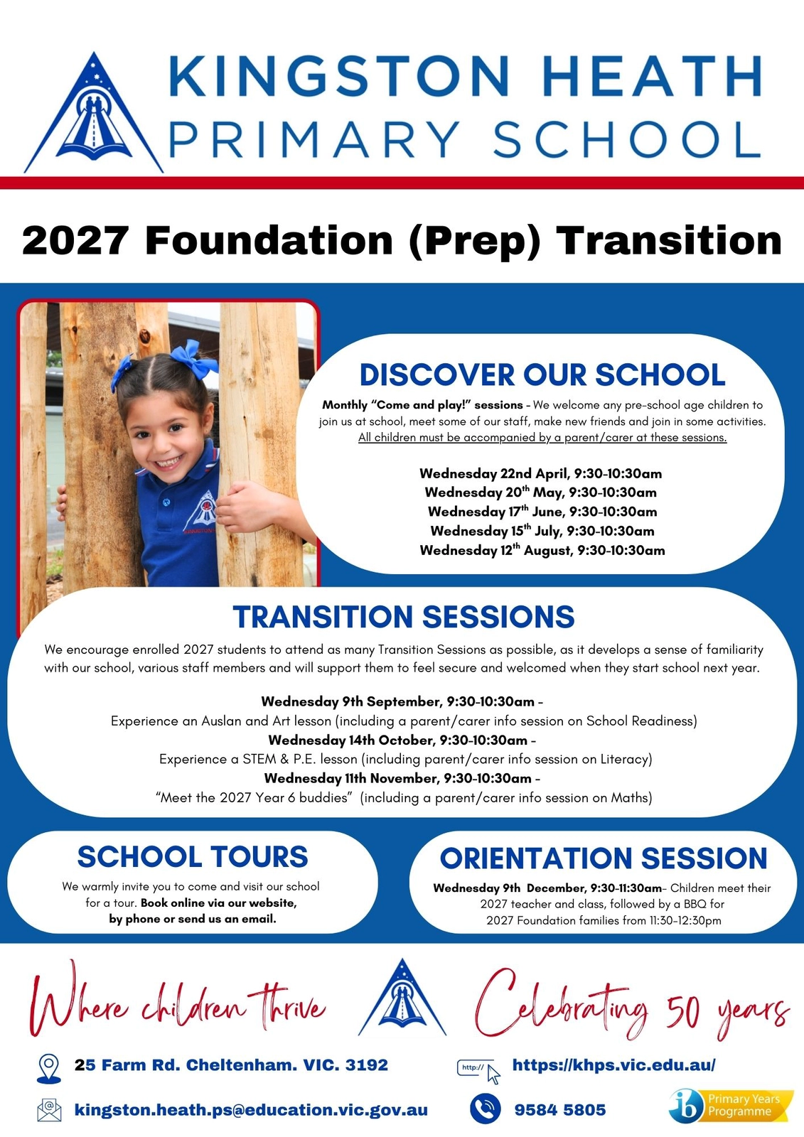 - Following this date, the school will contact all confirmed 2027 Foundation (Prep) families with information about Kingston Heath Primary School’s Transition Program during which you and your children will get to know the school and our wonderful staff, be provided with key dates, and other information to support a smooth start to your child’s school journey.